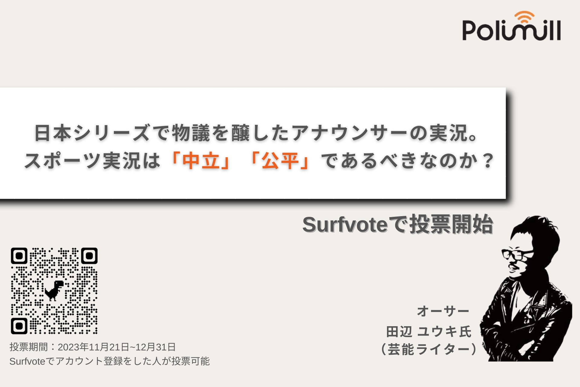 SNSとテクノロジーで社会課題の発見・解決をサポートするPolimill株式会社(ポリミル、本社:東京都港区、代表取締役:横田えり、以下Polimill社)はこのたび、イシュー「日本シリーズで物議を醸したアナウンサーの実況。スポーツ実況は「中立」「公平」であるべきなのか?」について、11月21日にSurfvoteへ掲載、一般ユーザーの意見投票が始まりましたのでお知らせします。