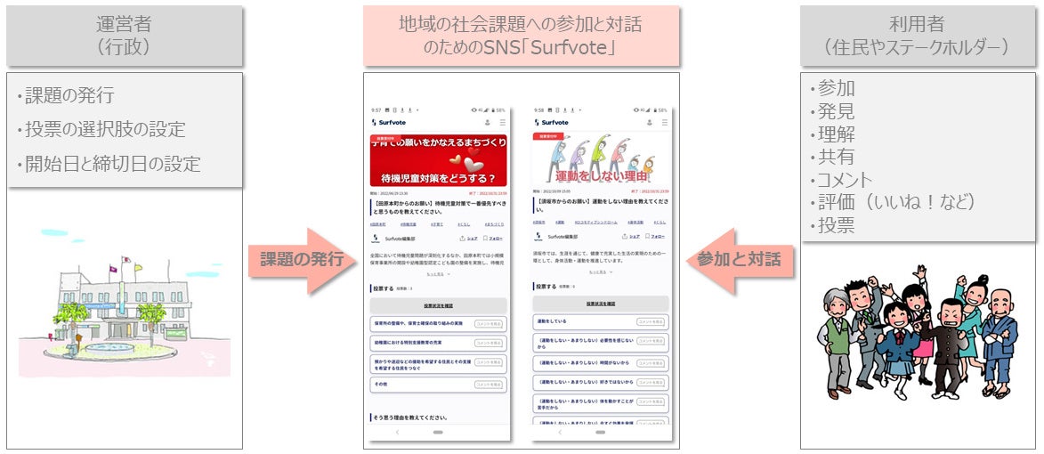 『Surfvoteローカル』はLINEやTwitter・Facebook・メールアドレスなどで登録すれば誰でも参加できるSNSで、各地域のさまざまな課題(イシュー)についてみんなの参加や発見・理解・共有・傾聴・投票・意見の積み上げ・対話で地域社会を前に進めるためのサービスです(対話機能は2023年リリース予定)。