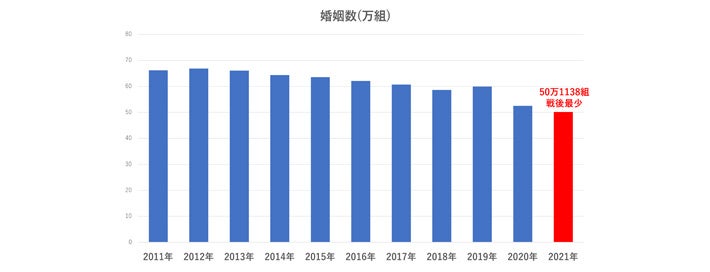 【婚姻数のグラフ(令和3年人口動態統計をもとにPolimiiが作成】