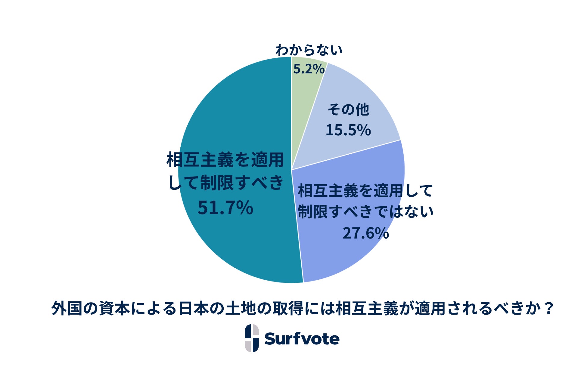 「外国の資本による日本の土地の取得に対しては、相互主義を適用して制限すべき」という意見が51.7%で最多。1年前の調査では「相互主義を適用して制限すべきではない」が57%で、昨年と逆転。