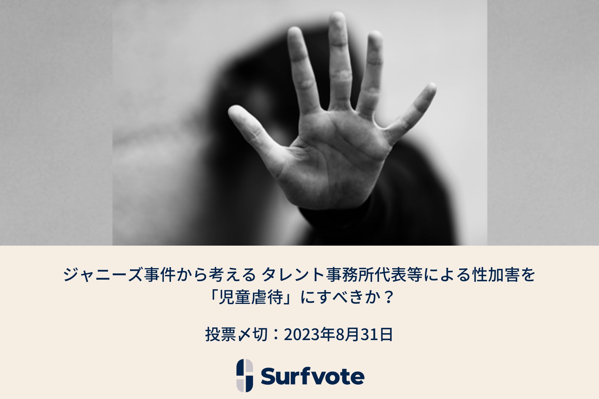 SNSとテクノロジーで社会課題の発見・解決をサポートするICTスタートアップのPolimill株式会社(ポリミル、本社:東京都港区、代表取締役:横田えり、以下Polimill社)は2023年6月21日、新イシュージャニーズ事件から考える タレント事務所代表等による性加害を「児童虐待」にすべきか?について、当社が運営するSurfvoteでユーザーの意見投票を開始しました。https://surfvote.com/issues/byldwvu0dd7a
