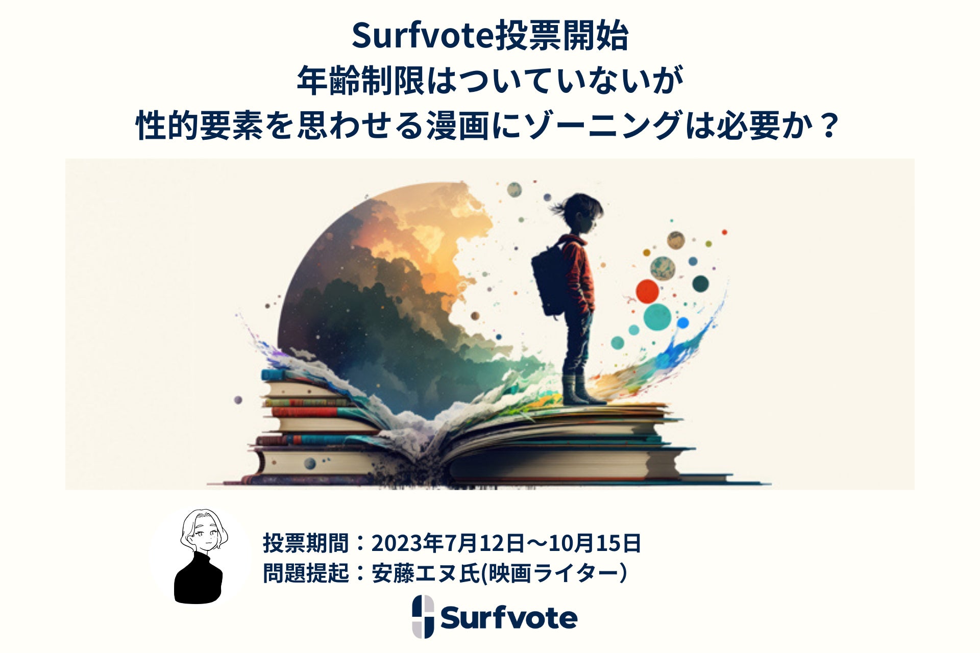 SNSとテクノロジーで社会課題の発見・解決をサポートするICTスタートアップのPolimill株式会社(ポリミル、本社:東京都港区、代表取締役:横田えり、以下Polimill社)は2023年7月12日、新イシュー「年齢制限はついていないが性的要素を思わせる漫画にゾーニングは必要か?」についてSurfvoteで意見投票を開始しました。https://surfvote.com/issues/uvev90x0y71d