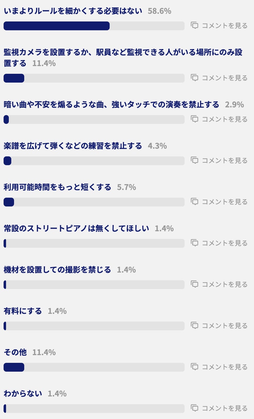 非常識な行為が増えたり、ストリートピアノを悪用したりするケースが実際起こっているのであれば、問題を最小限に抑えることができる厳格なルールや監視が必要になってくるのではないでしょうか。(賛同数4)