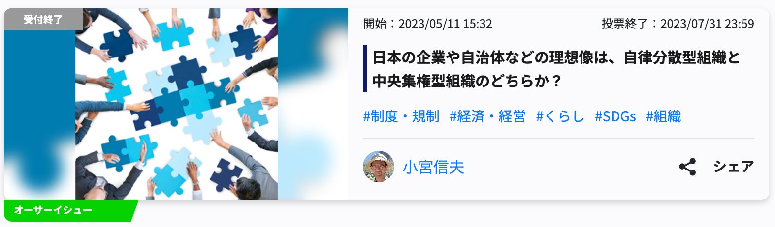 SNSとテクノロジーで社会課題の発見・解決をサポートするICTスタートアップのPolimill株式会社(ポリミル、本社:東京都港区、代表取締役:横田えり、以下Polimill社)は当社が運営・開発する社会デザインプラットフォームSurfvoteで、2023年5月11日から7月31日までの期間、「日本の企業や自治体などの理想像は、自律分散型組織と中央集権型組織のどちらか?」というイシュー(課題)について、ユーザーの意見投票を行いましたので、その結果をお知らせいたします。Surfvoteは、社会のさまざまな課題や困りごとをイシュー(課題)として発行し、ユーザーが自分の意見を投票してコメントすることのできるプラットフォームです。