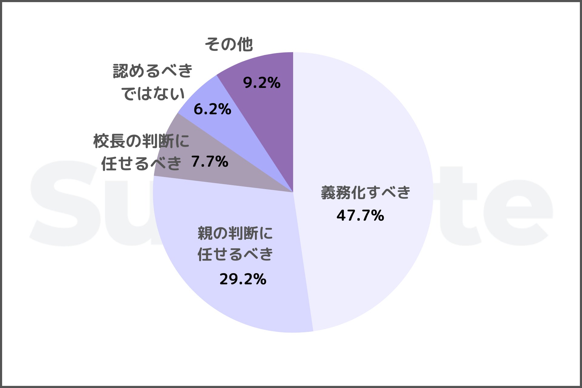 『ゴーグルの着用を義務化すべき』47.7%『ゴーグルを着用するかは、親の判断に任せるべき』29.2%『ゴーグルを着用するかは、校長の判断に任せるべき』7.7%。