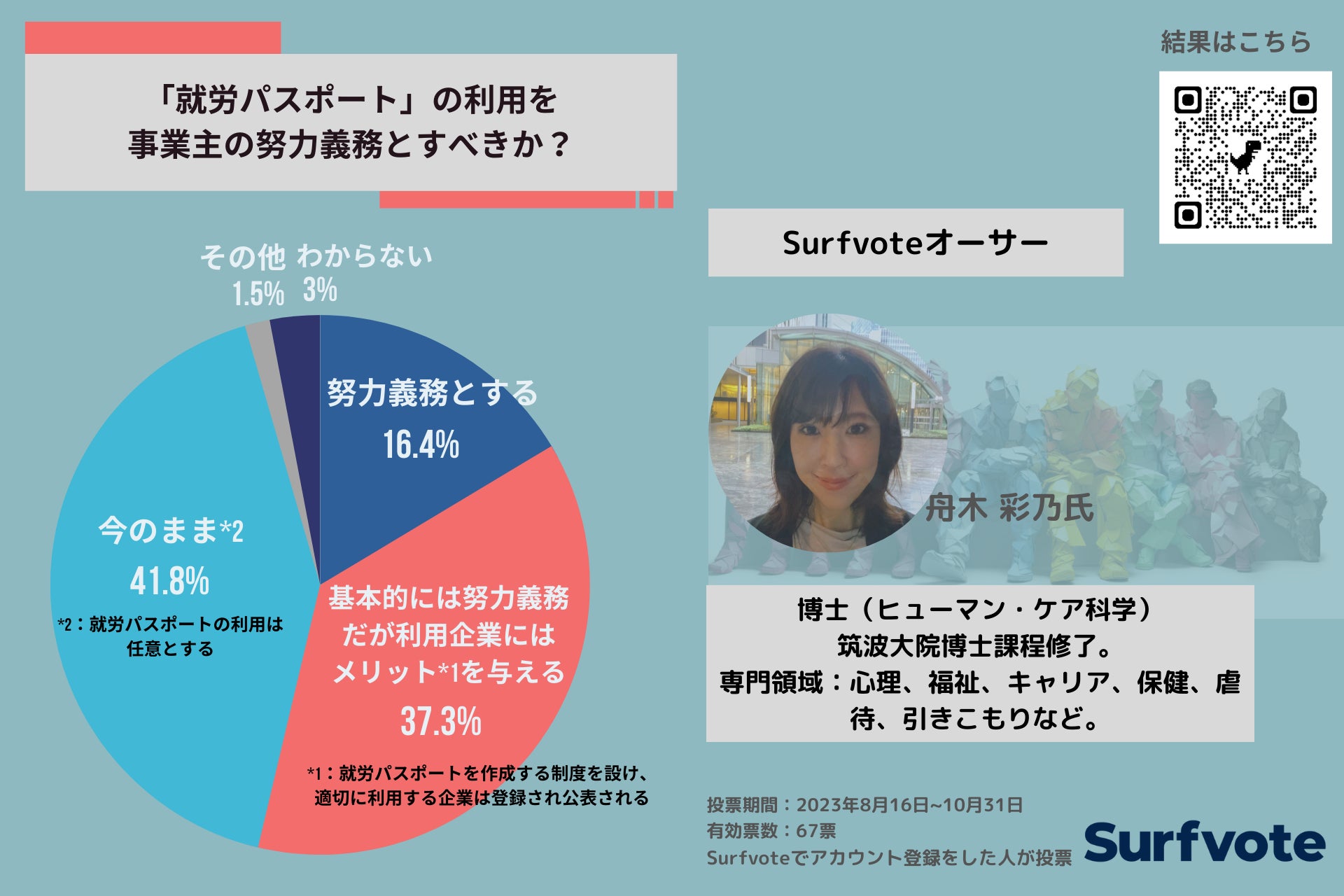 SNSとテクノロジーで社会課題の発見・解決をサポートするPolimill株式会社(ポリミル、本社:東京都港区、代表取締役:横田えり、以下Polimill社)はこのたび、「「就労パスポート」の利用を事業主の努力義務とすべきか?」というイシュー(課題)について10月31日に投票が終了しましたので結果をお知らせします。